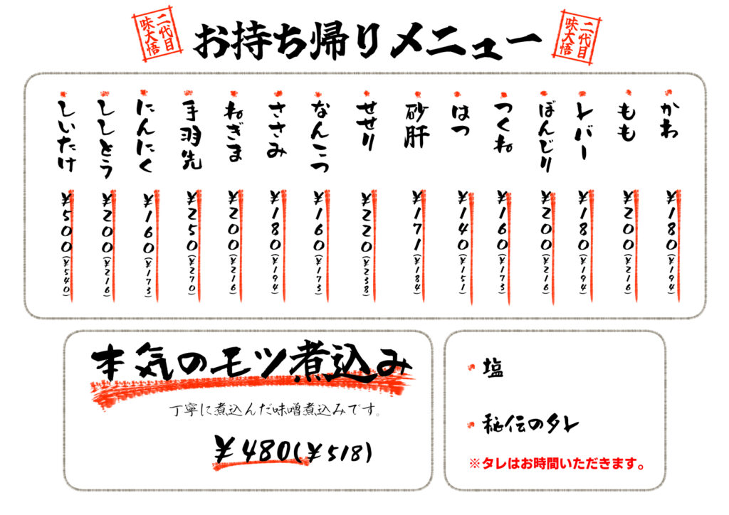 焼き鳥・もつ煮込みはテイクアウトOK!(ご予約可/店頭でのみ承っております)